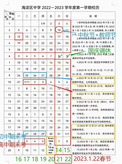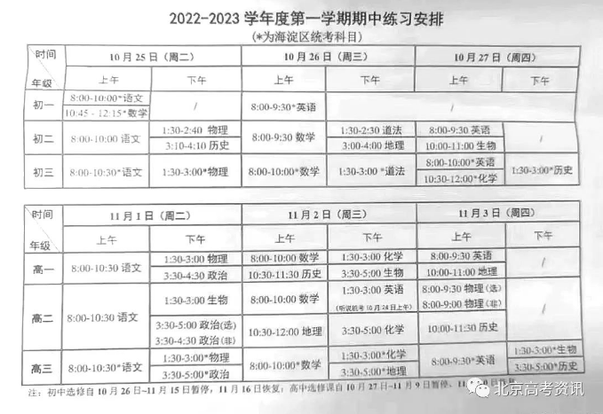 各区期中时间安排:2022-2023学年北京海淀、朝阳等区高一高二高三期中考试时间安排