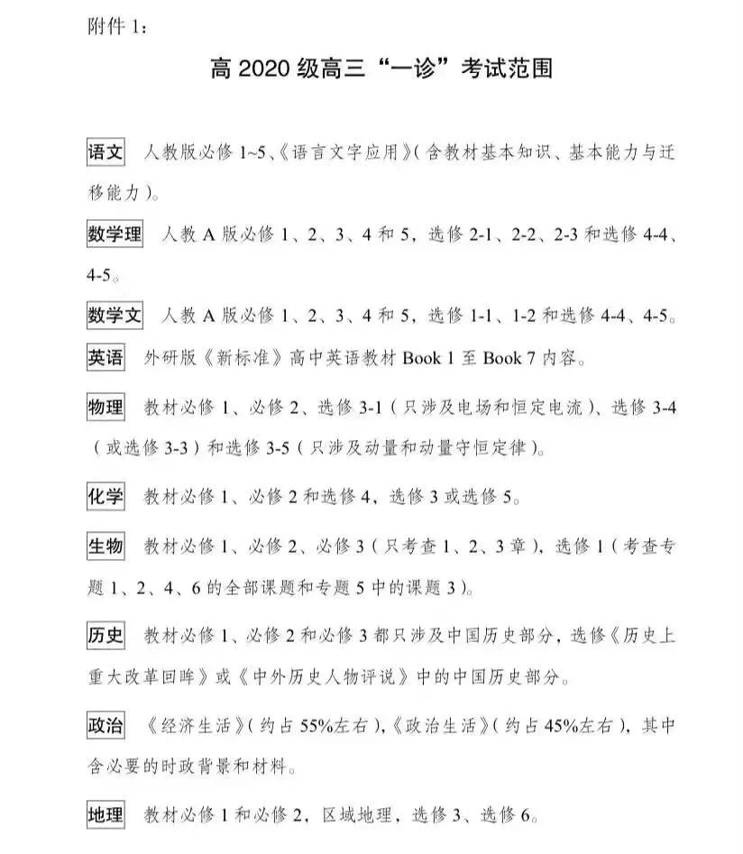 2023届成都一诊考试时间/考试范围已确定。具体详情如下: