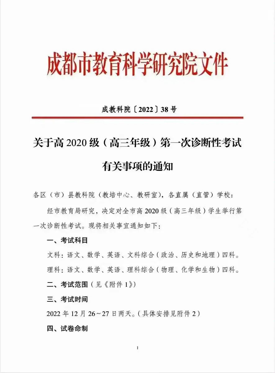 2023届成都一诊时间定于2022年12月26-27日进行,以下为通知文件: