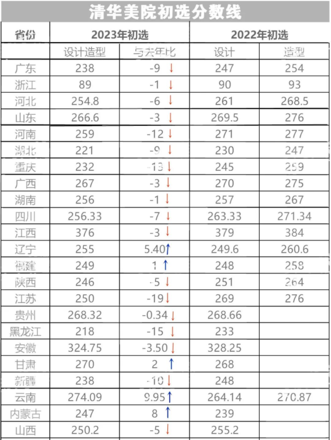 清华大学美术学院2023年初选线普通降低,跟2023年增加了文化综合素养测试有关。一方面,文化素养测试合格方能参加清华大学美术学院的校考,另一方面2023年要求美术学类的文化线达到一本线,这对造型类考生而言,文化线要达到一本线的并不多。