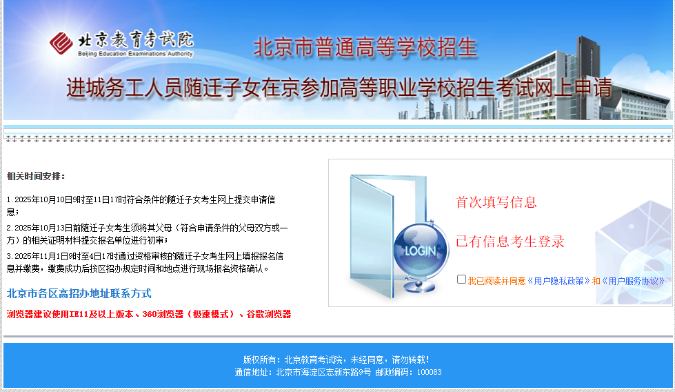 2025年10月10日9时至11日17时符合条件的随迁子女考生网上提交申请信息,网上申请入口已经开通,北京高考在线团队特意整理了相关内容如下:
