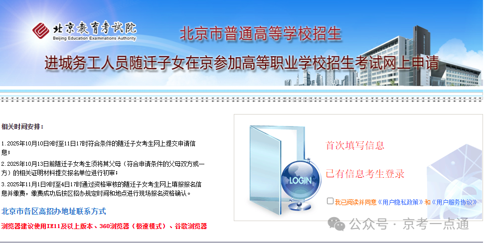 9月25日,北京教育考试院发布了关于做好2026进城务工人员随迁子女在京参加高职招考报名工作通知,北京高考在线团队特意整理了2026进城务工人员随迁子女在京参加高职招考报名入口,供考生参考。