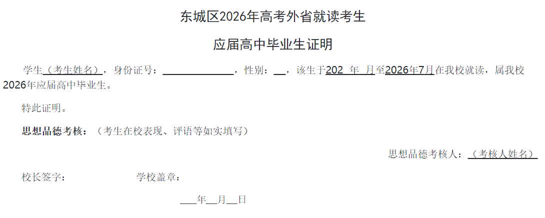 北京教育考试院关于做好北京市2026年普通高等学校招生报名工作的通知发布,京外就读应届考生还须持就读学校开具的证明及思想品德考核意见,北京高考在线整理了东城区应届高中毕业生证明样表,供考生参考。