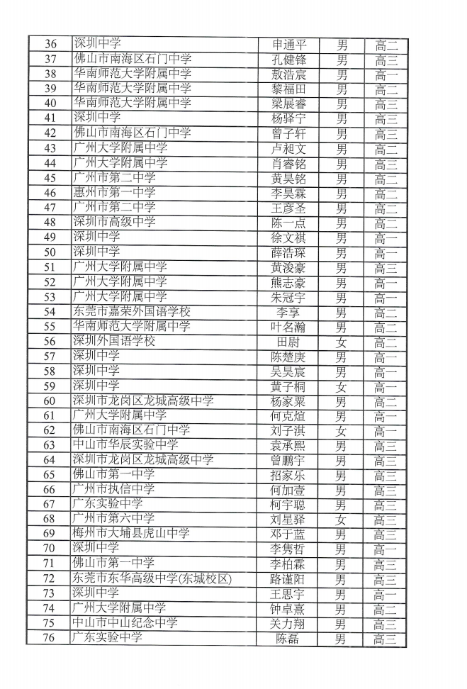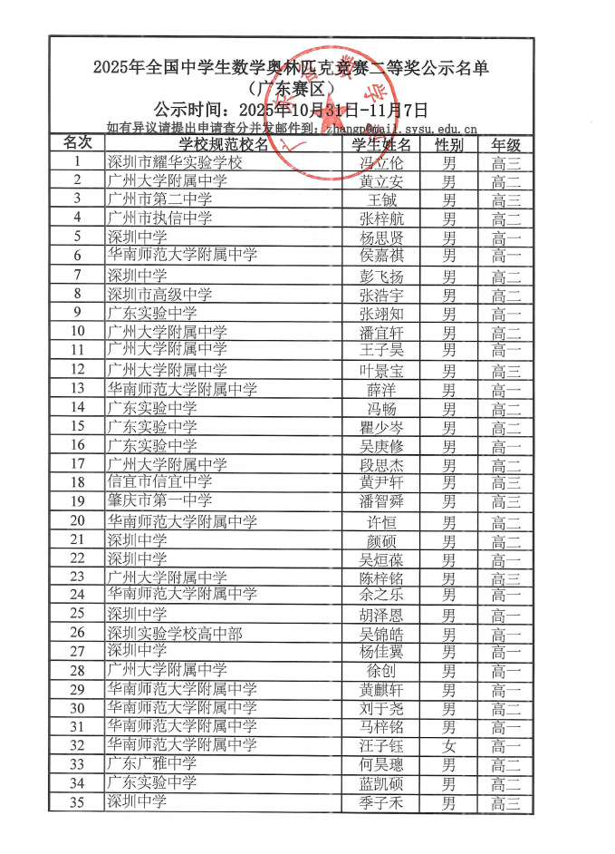 2025年全国中学生数学奥林匹克竞赛二等奖公示名单(广东赛区)公示时间:2025年10月31日-10月7日如有异议请提出申请查分并发邮件到:zhangp@mail.sysu.edu.cn我们会组织专家进行复查并尽快回复您!