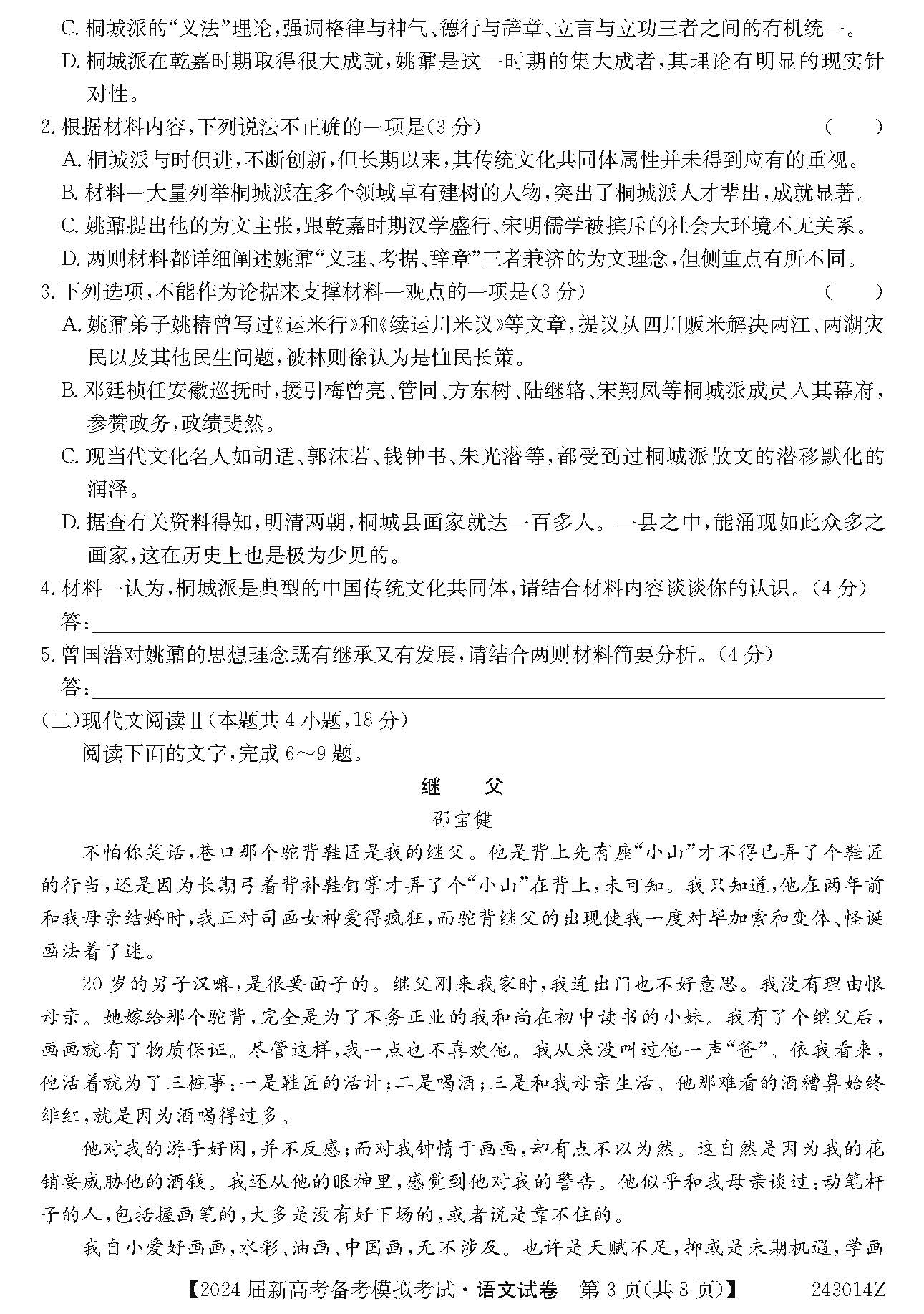 甘肃2024届新高考备考模拟考试(开学考试)语文试题及答案