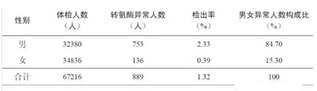 根据《北京市2015 年度体检统计资料报告》,2015年北京市高招体检总人数67216人,但是其中有889人被查出转氨酶异常,检出率为1.32%,其中男、女生构成比分别为84.70%、15.30%。