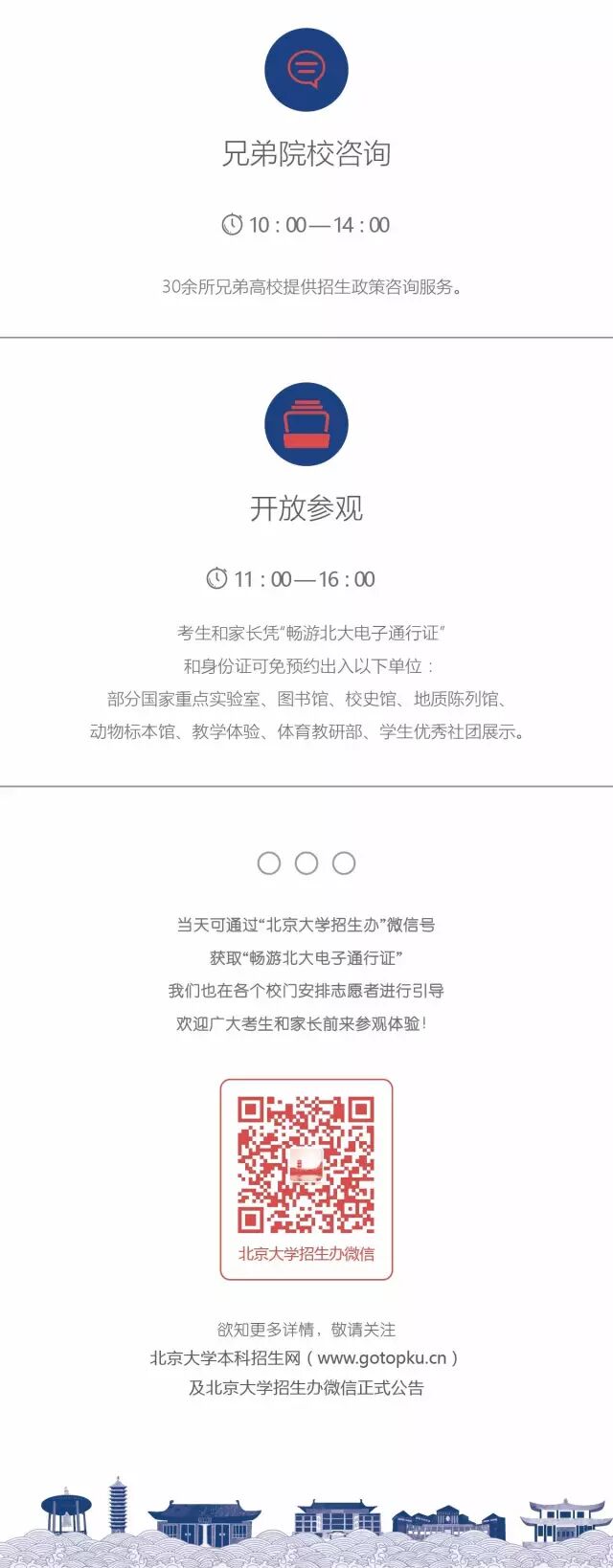 关注北京大学招生办微信号,5月17日起点击左下角“开放日通行证”,即可获取“畅游北大电子通行证”,当天招生信息发布会盛况也会在网上同步直播。