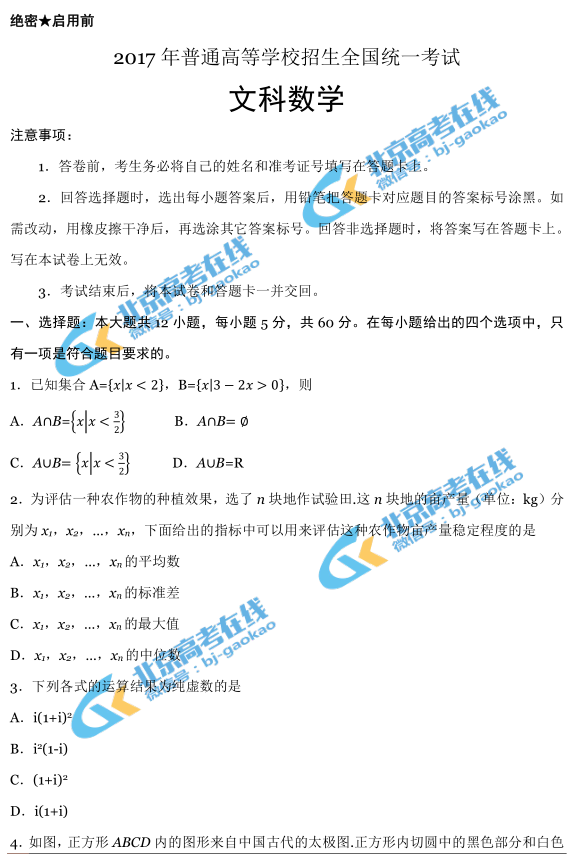2017年高考全国I卷数学考试于6月7日上午3:00-5:00进行,2017年高考全国I卷数学试题真题(文科)已经出炉!