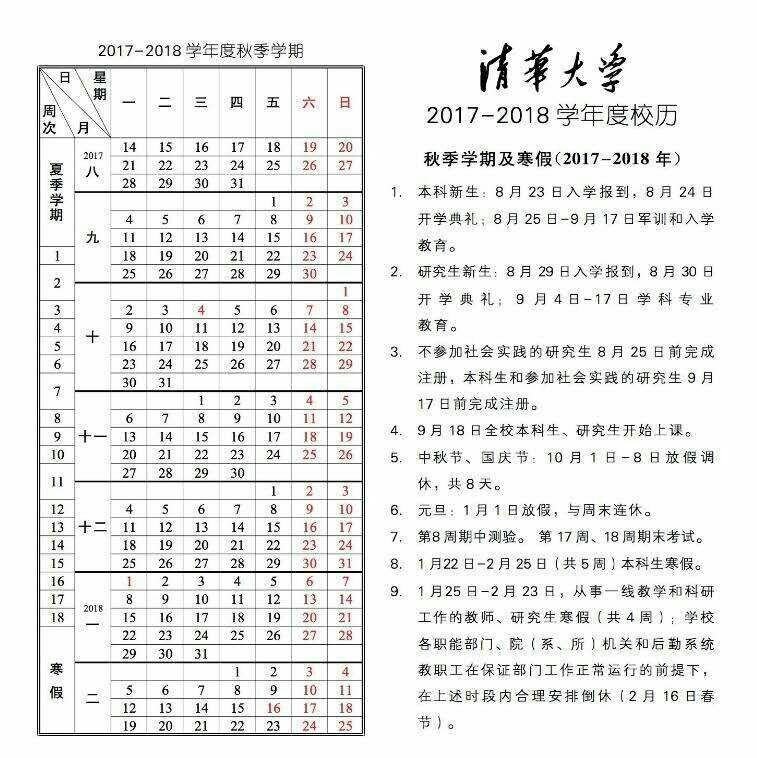 清华大学2017-2018年度校历来了,赶快来看看今年清华大学学年度是怎么安排的吧!