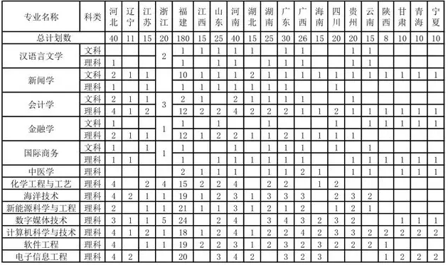汉语言文学、新闻学、会计学、金融学、国际商务、中医学、化学工程与工艺、海洋技术、新能源科学与工程、数字媒体技术、计算机科学与技术、软件工程、电子信息工程。