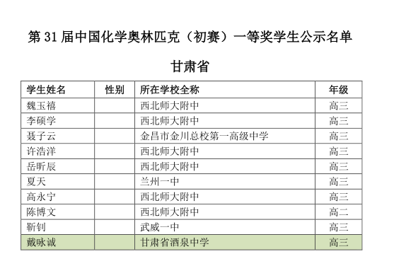 第31届中国化学奥林匹克(初赛)一等奖获奖名单(甘肃赛区)已经公布,请及时下载附件查看!