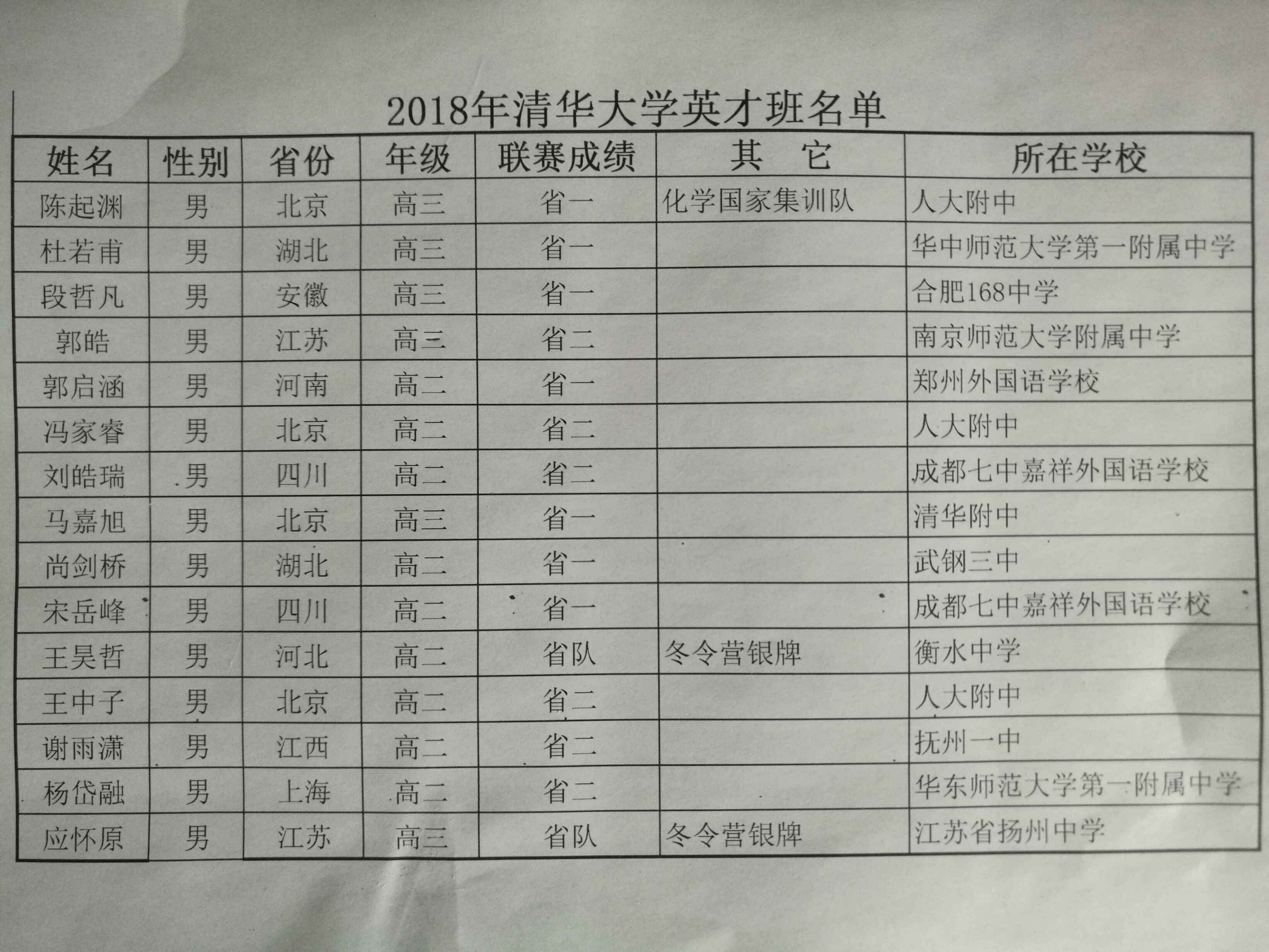 清华大学首届丘成桐数学英才班新生数据2018-08-23