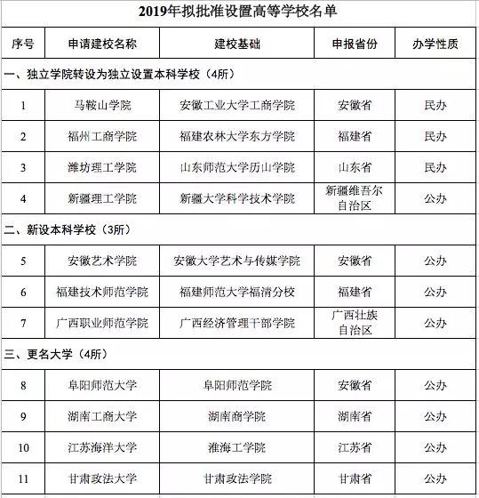 名单中包含,“独立学院转设为独立设置本科学校”4所,“新设本科学校”3所,“更名大学”4所,具体如下: