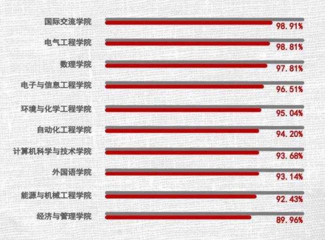 上电各院系2020届本科毕业生共计2601,总体就业率94.54%。其中就业率最高的三个学院分别为国际交流学院(98.91%)、电气工程学院(98.81%)和数理学院(97.81%),就业率最低的是经济与管理学院(89.96%)。