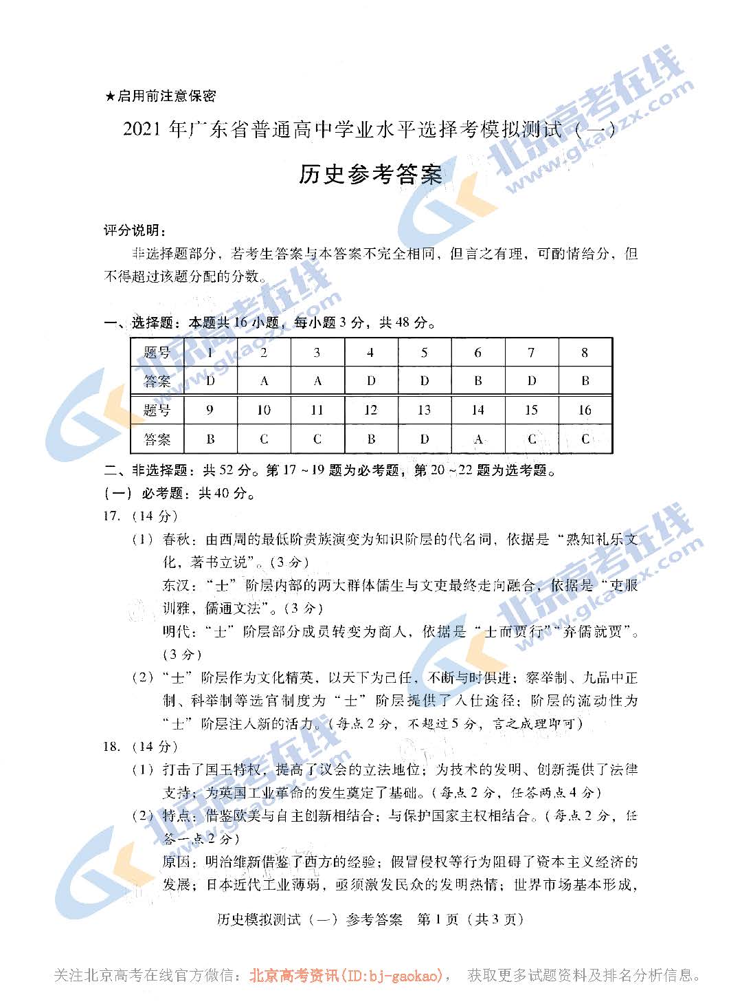 2021年广东高三一模历史试题及答案