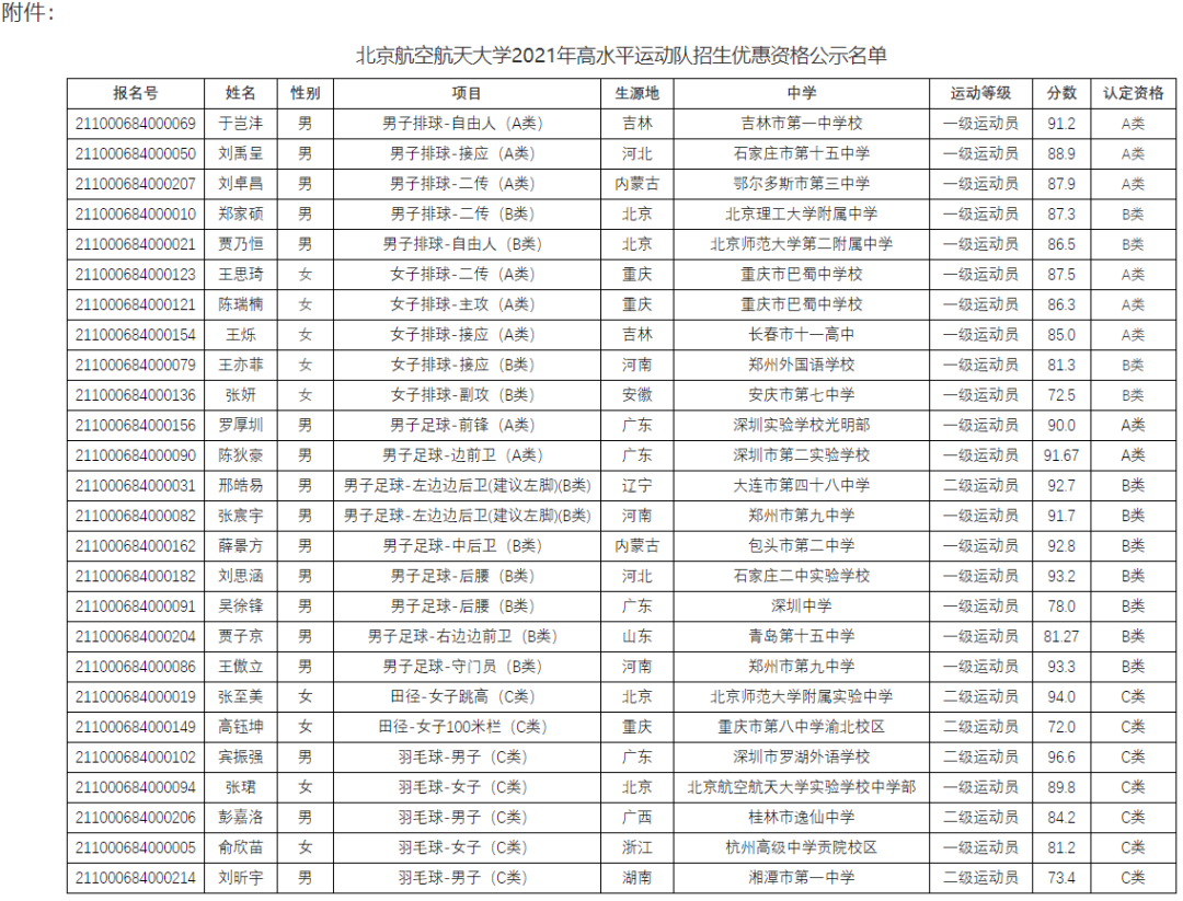 北京航空航天大学2021年高水平运动队资格名单已公示,详情如下: