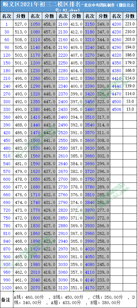 2021顺义初三二模区排名