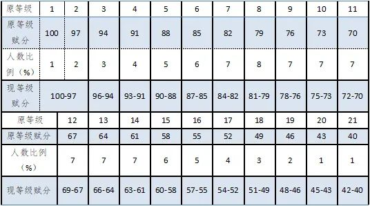 注意:从2022年1月选考起,选考科目等级赋分的分差由3分改为1分。在原21等级基础上划分为20个赋分区间,将原第1(1%,100分)、第2(2%,97分)两个等级合并为一个赋分区间,其余不变。各对应区间内按等比例转换,四舍五入将卷面得分转换为等级分。