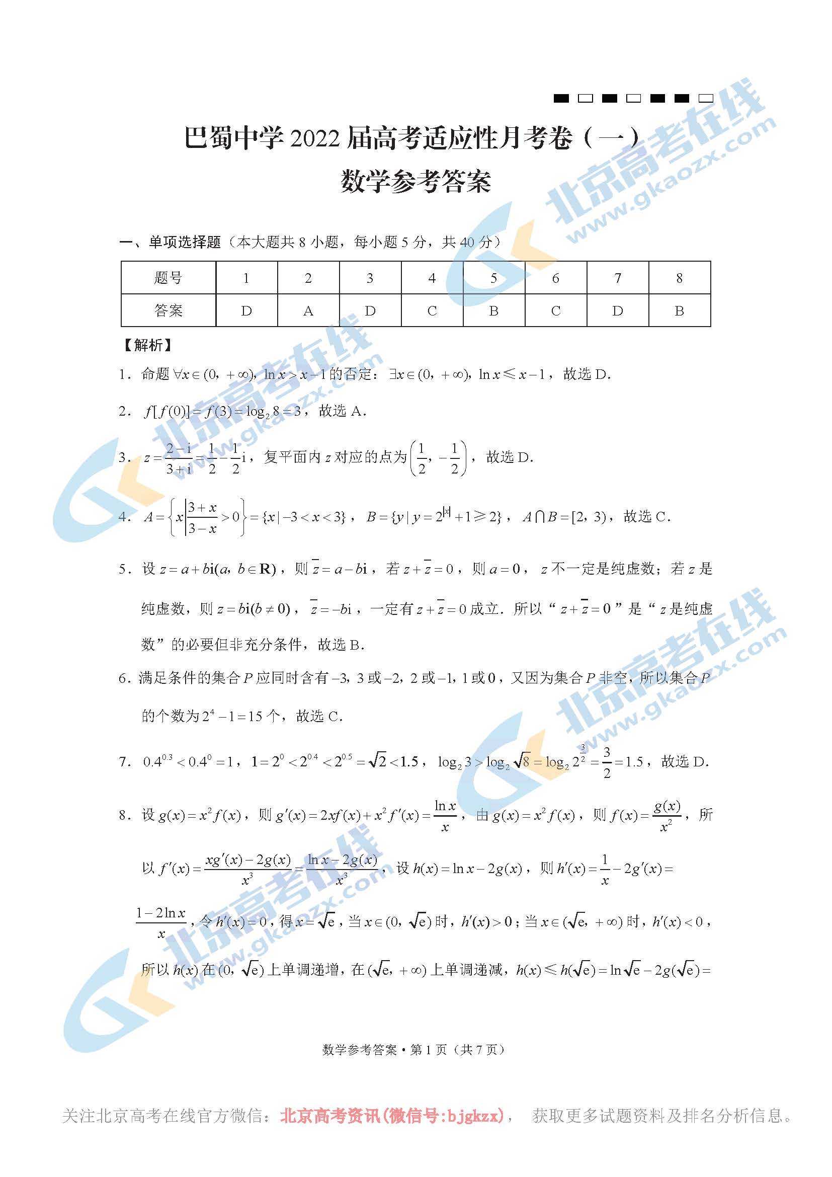 北京高考在线整理了重庆巴蜀中学2022届高考学生数学试题及答案,分享给大家。