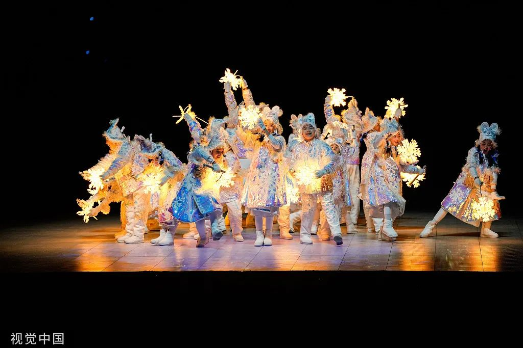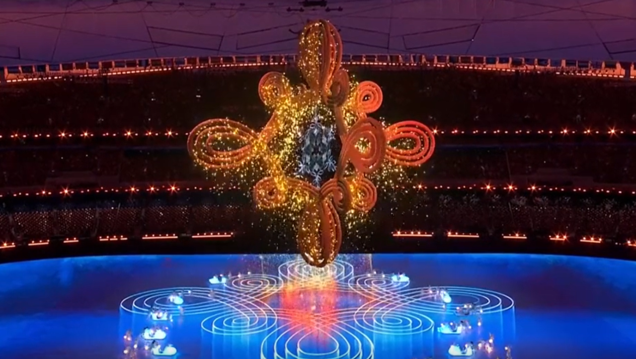 灵动的音乐中,孩子们用绚烂的雪花花灯,与空中闪亮的大雪花火炬互动,点亮了场地上的“冬”字会徽。在斑斓炫丽的色彩中,北京2022年冬奥会闭幕式正式开启!
