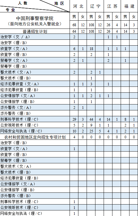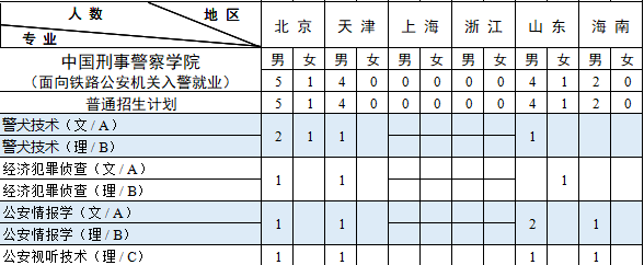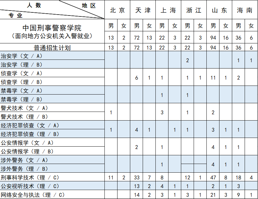在北京、天津、上海、浙江、山东、海南 6 个省(市),招生计划不分文科、理科和 A 类、B 类、C 类。其中,公安学类专业招生计划要求必选政治(下同)。