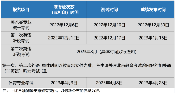2023年北京高考报名通知中介绍了英语听说考试、美术类专业统一考试、体育专业考试等3类北京市普通高等学校招生考试安排。一起来看详细安排。