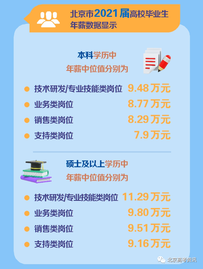 北京市2021届高校毕业生薪酬数据显示,在本科学历中,技术研发/专业技能类岗位、业务类岗位、销售类岗位、支持类岗位薪酬中位值分别为9.48万元、8.77万元、8.29万元和7.9万元;在硕士及以上学历中,这四类岗位的薪酬中位值分别为11.29万元、9.80万元、9.51万元和9.16万元。
