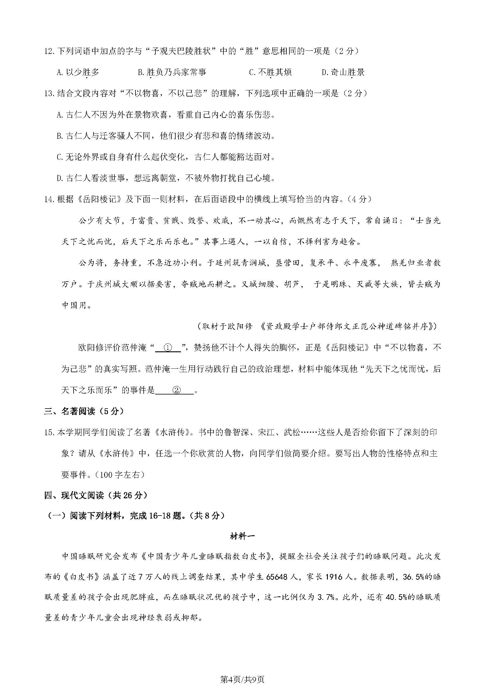 2023年北京市门头沟区初三上学期期末语文试题及答案