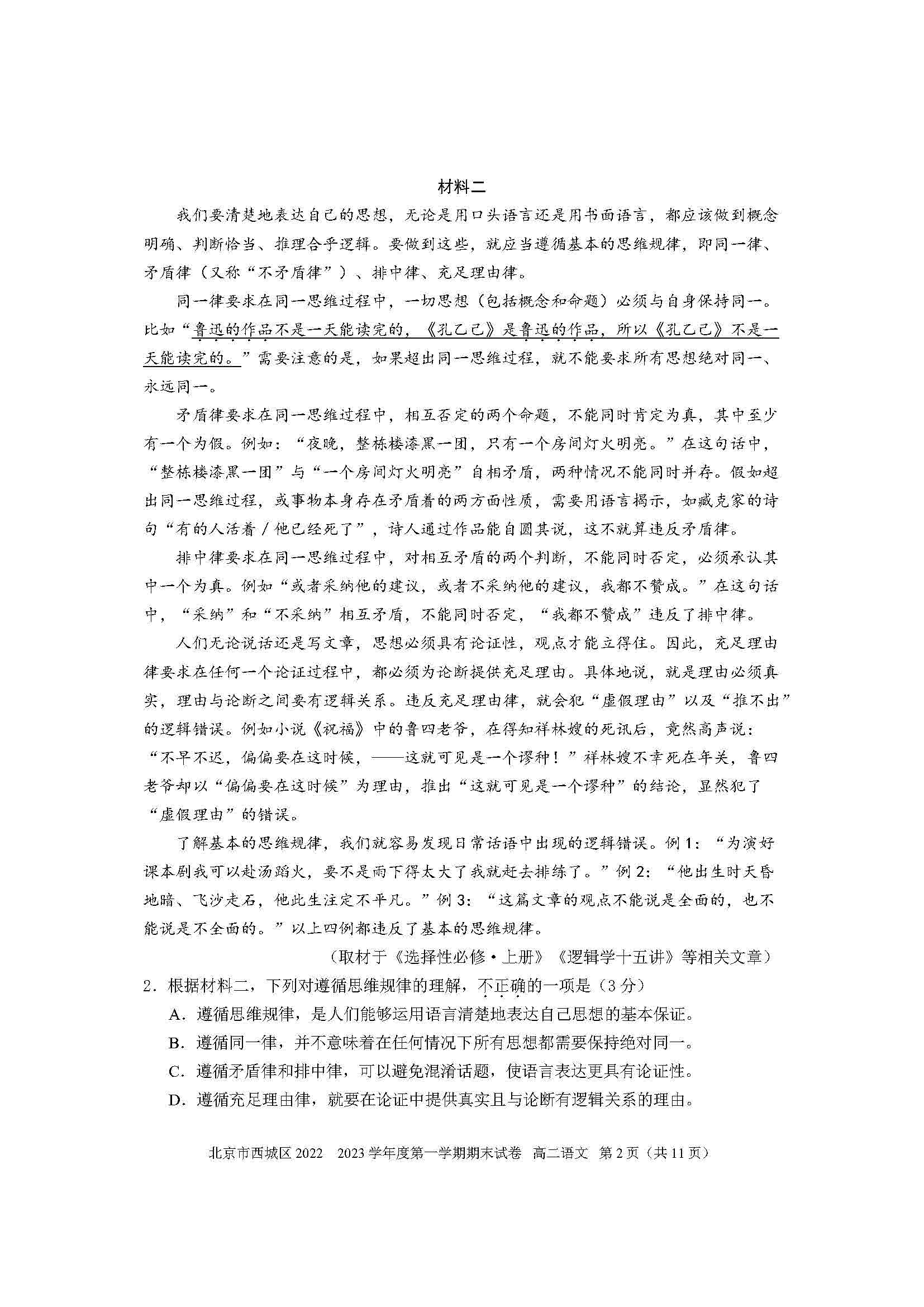 本文整理了北京西城区2023年高二上学期期末语文试题及答案,分享给同学们。