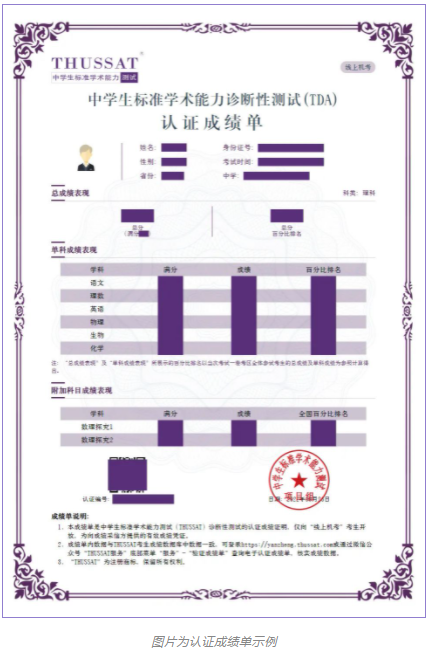 TDA参试考生可申请认证成绩单。成绩单是THUSSAT诊断性测试(TDA)的认证成绩证明,是向成绩采信方提供的有效成绩凭证。部分采信认证成绩单的项目: