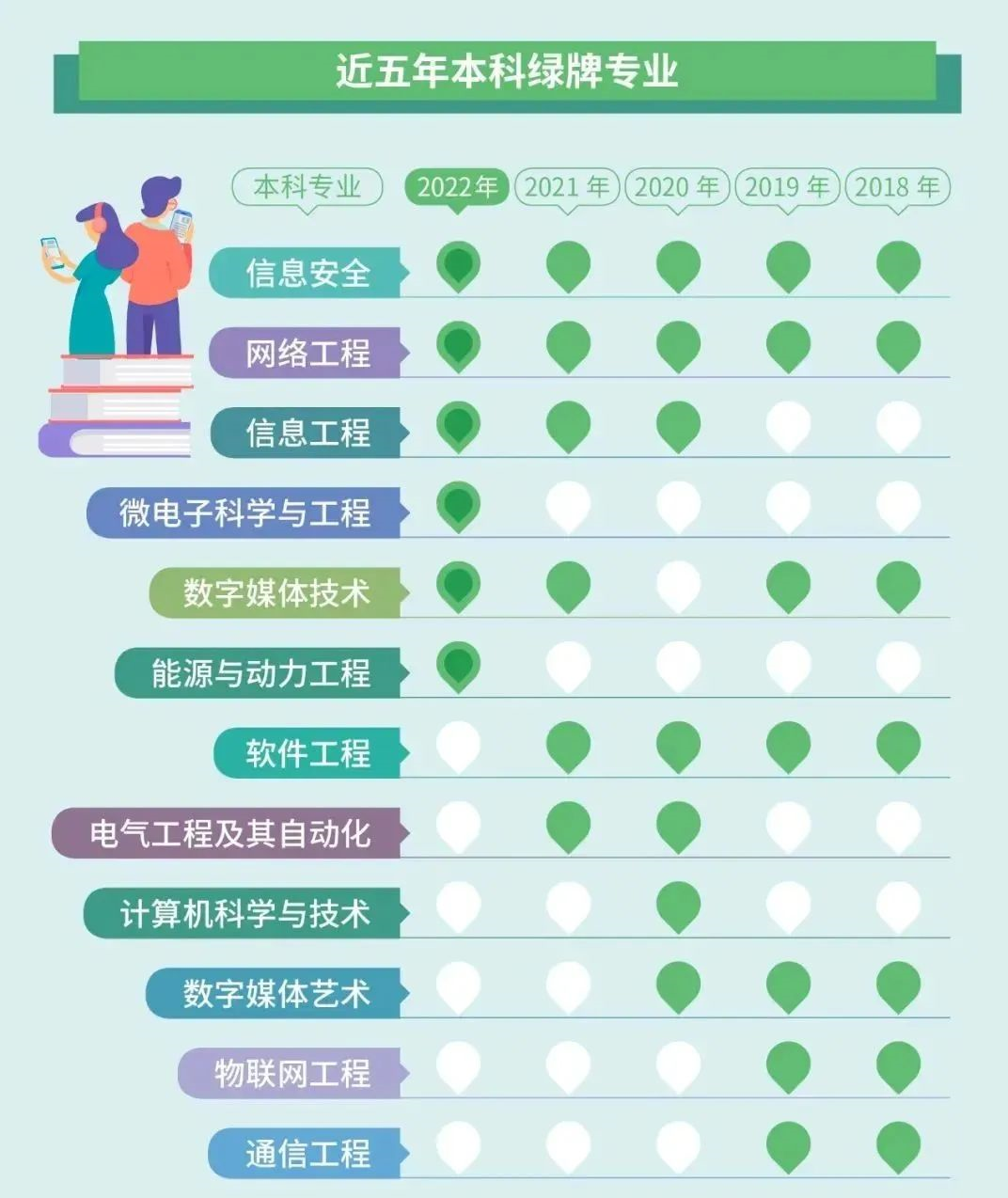 2022年本科专业进入榜单的有信息安全、网络工程、信息工程、微电子科学与工程、数字媒体技术、能源与动力工程。