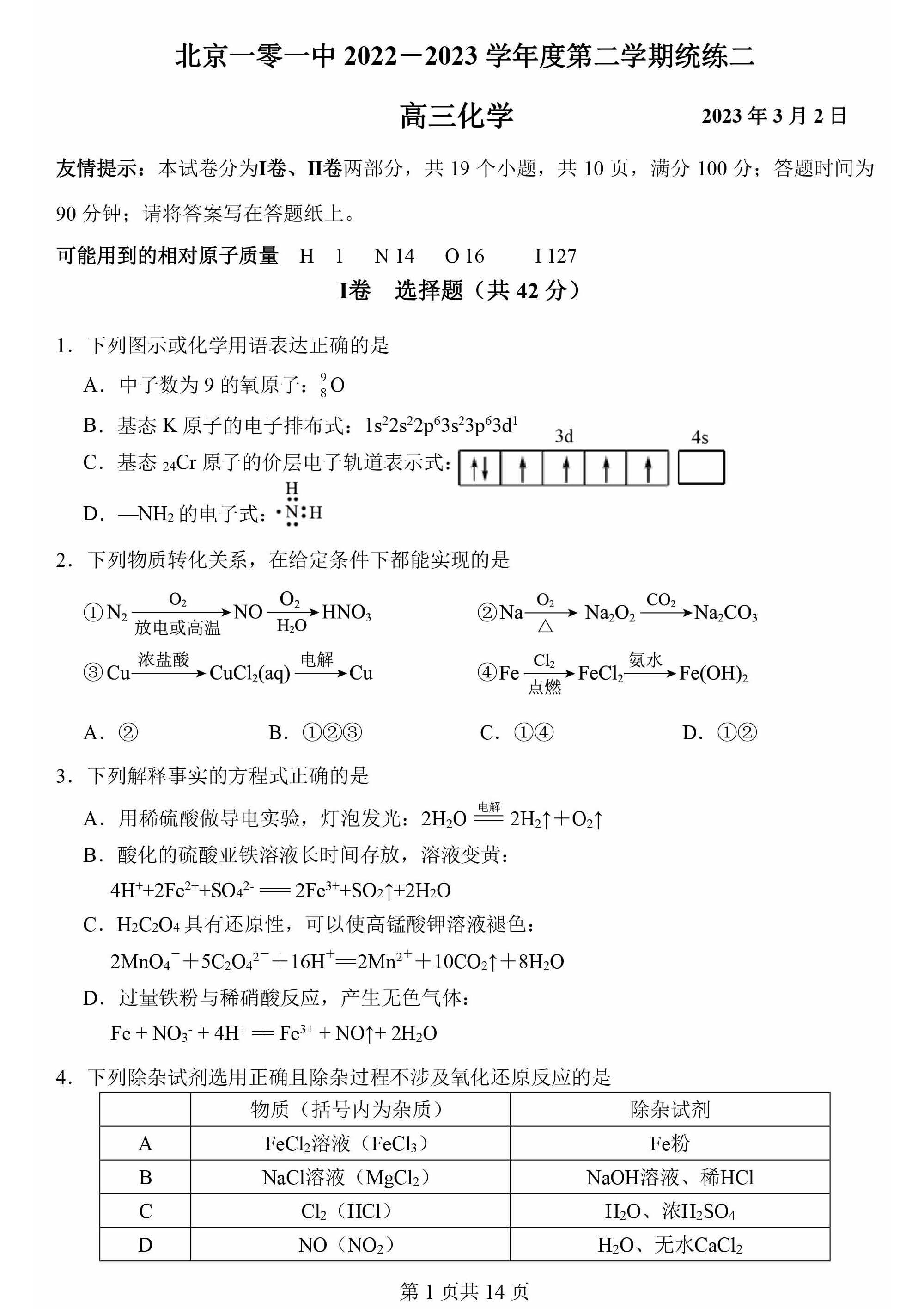 立即下载:2023北京一零一中学高三3月月考化学试题及答案