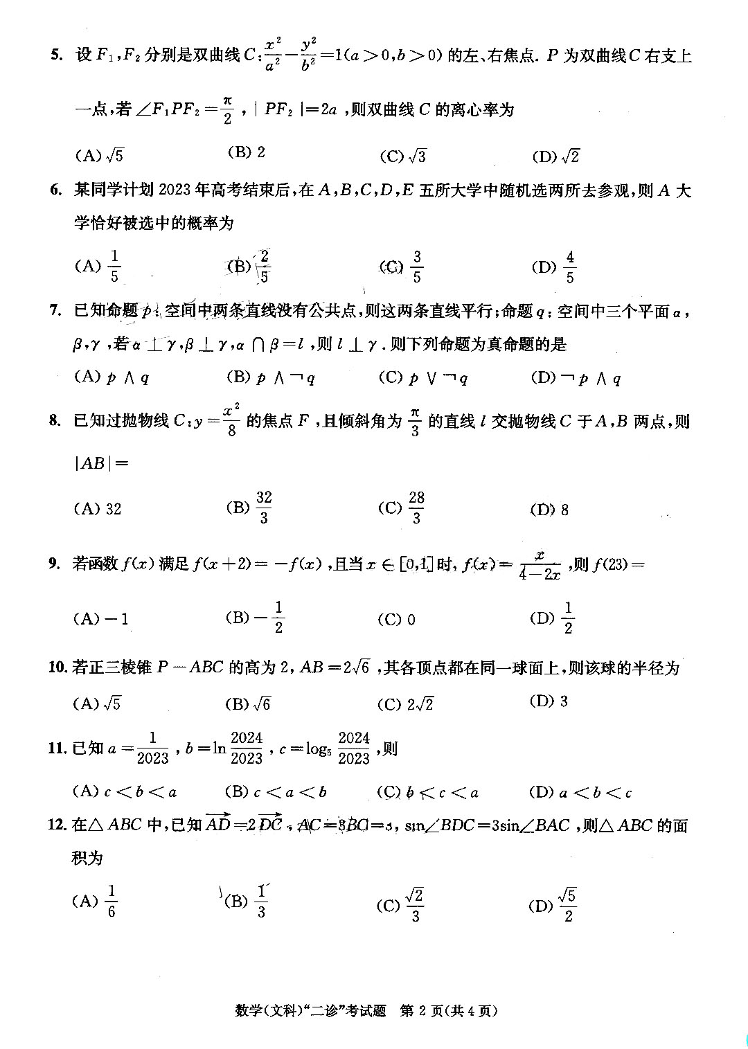 2023成都二诊文科数学试题及答案