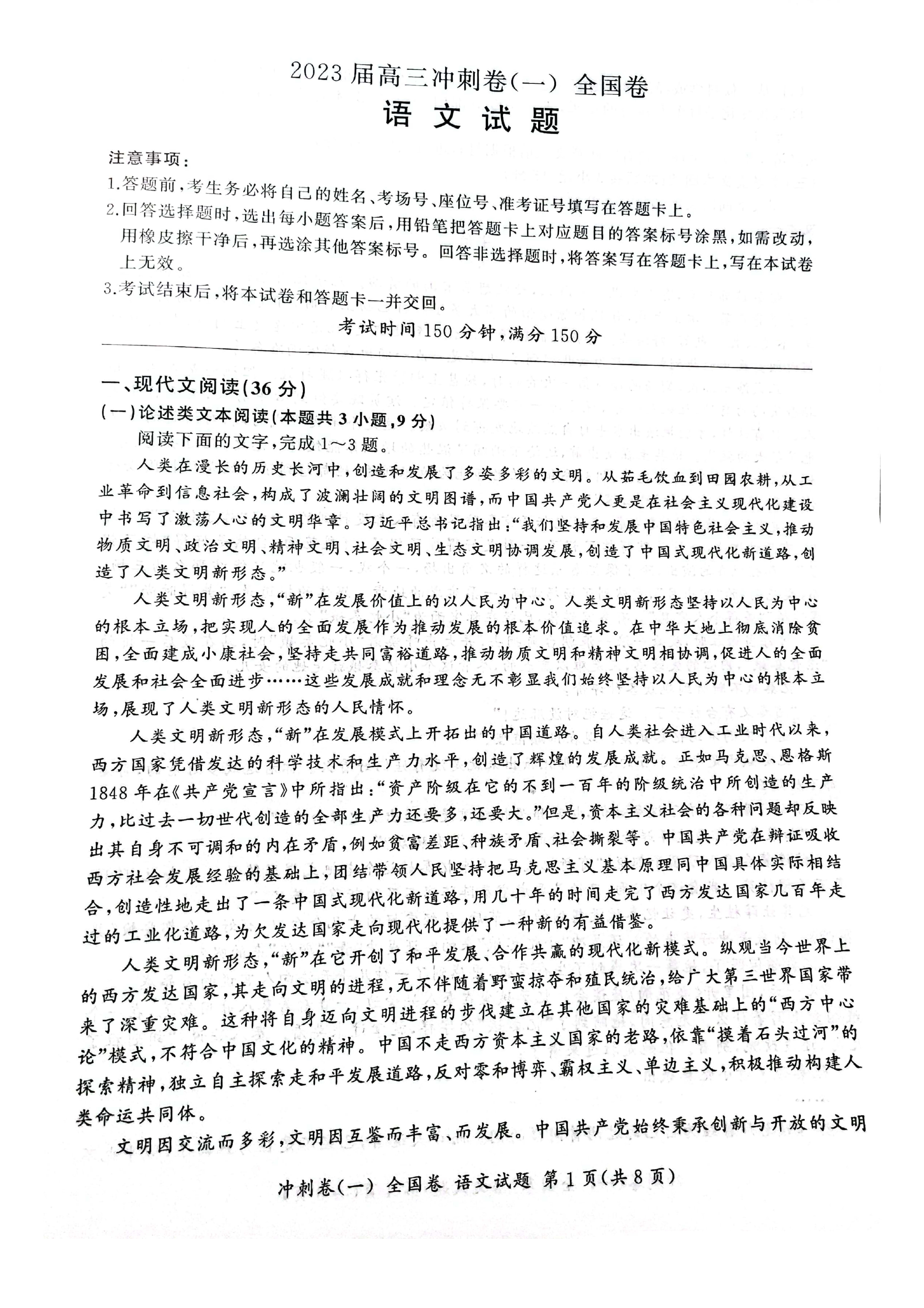 2023届高三百师联盟3月冲刺卷(一)老高考语文试题及答案