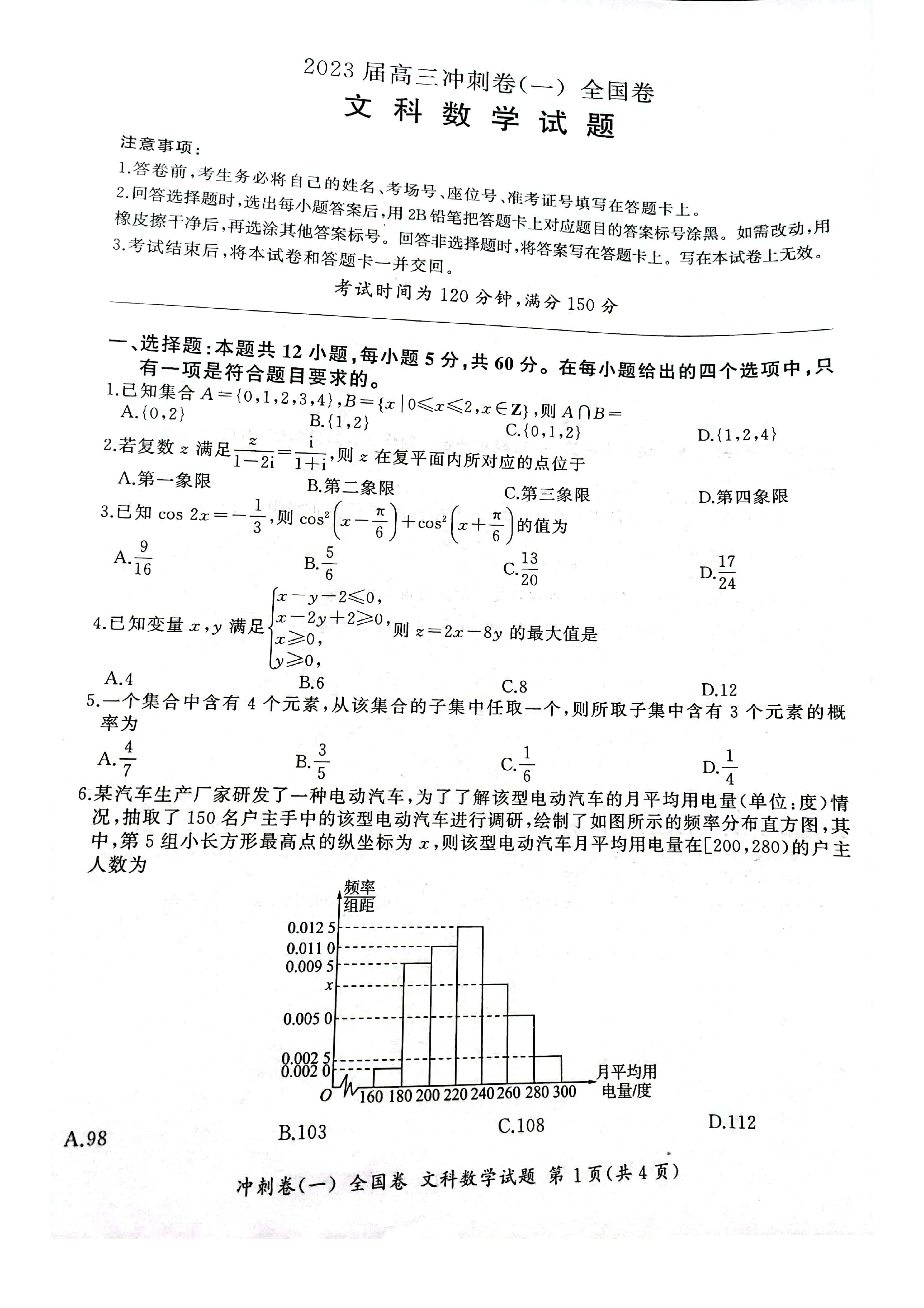 2023届高三百师联盟3月冲刺卷(一)老高考文科数学试题及答案