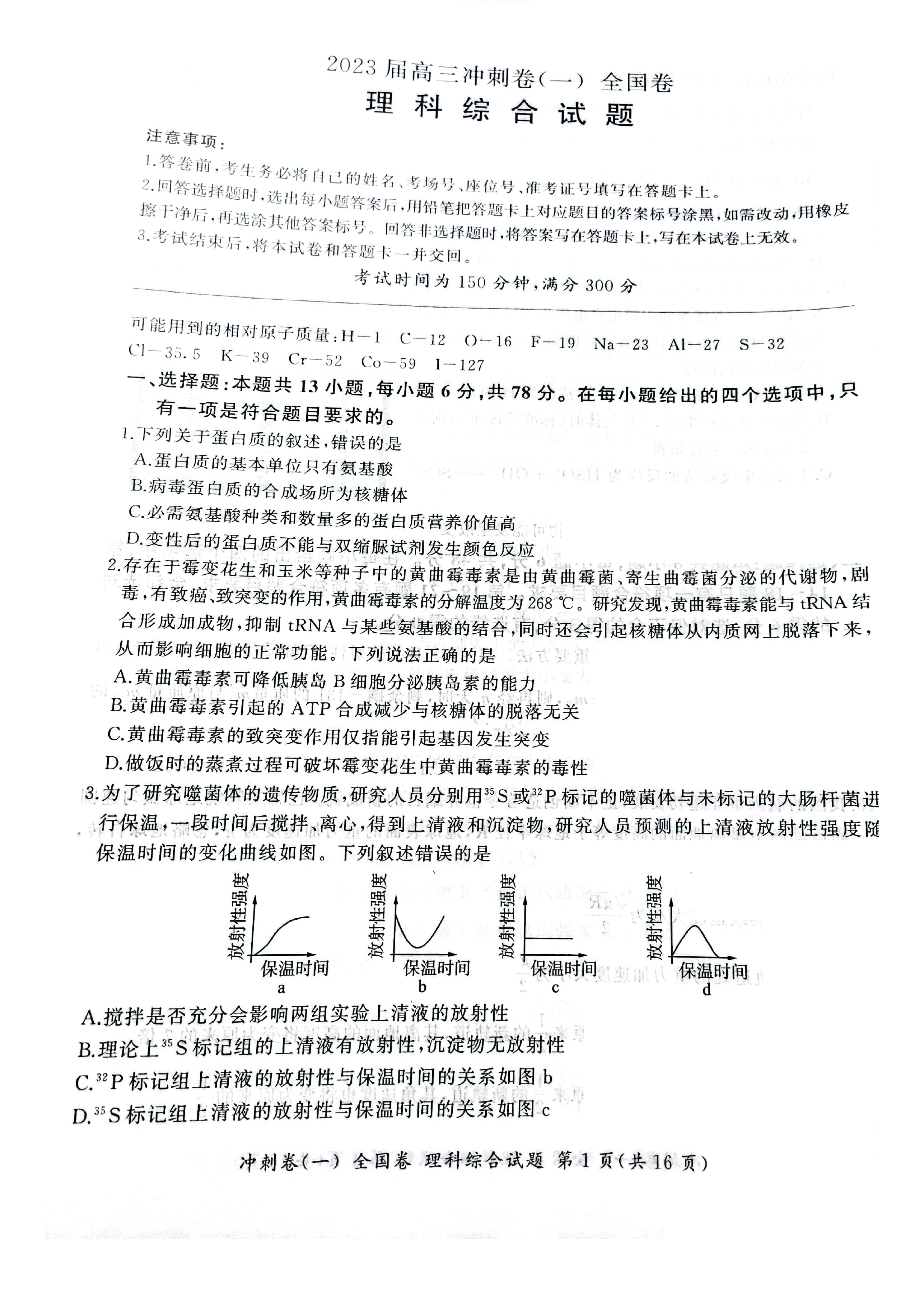 2023届高三百师联盟3月冲刺卷(一)老高考理综试题及答案