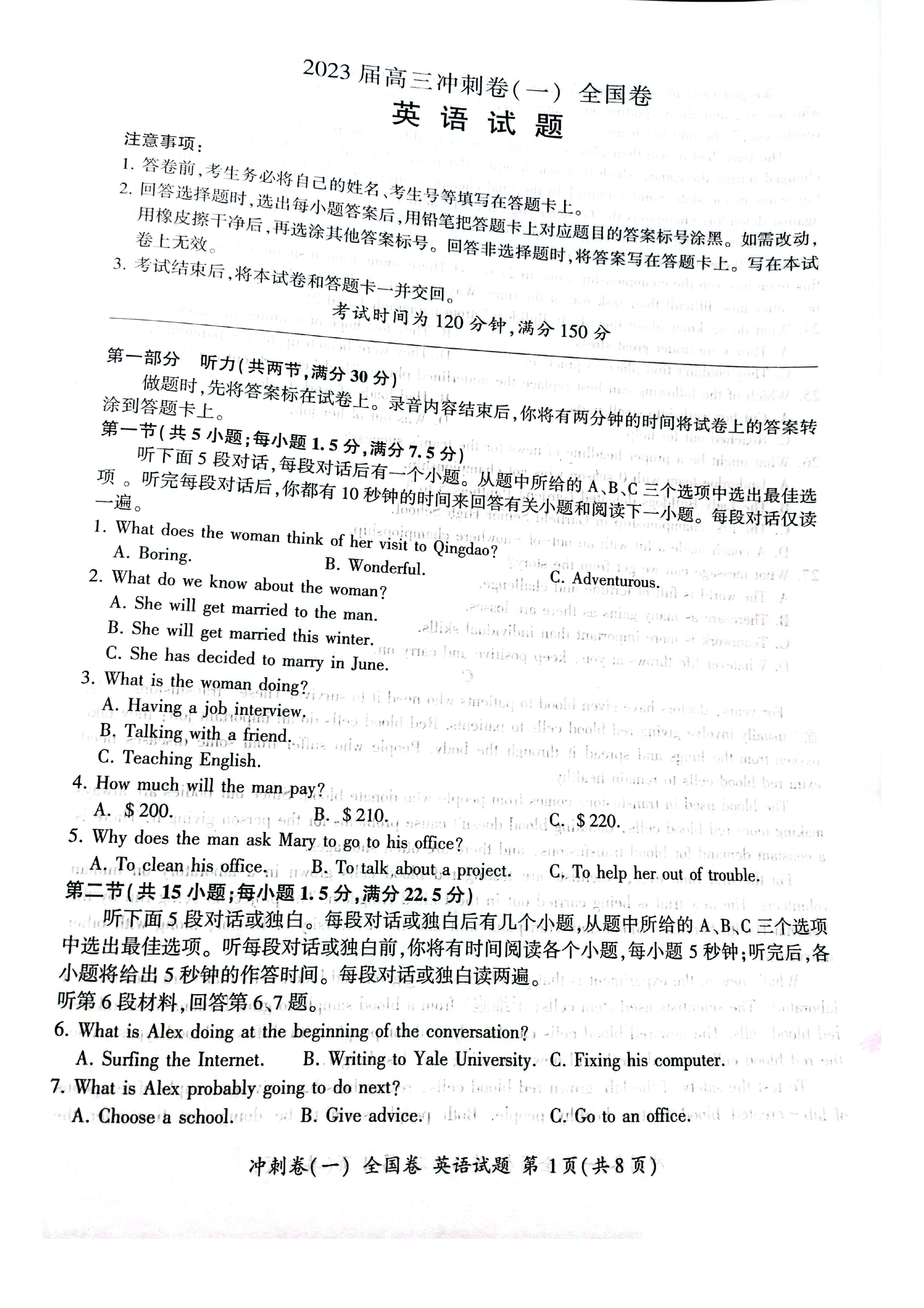 立即下载:2023届高三百师联盟3月冲刺卷(一)老高考英语试题
