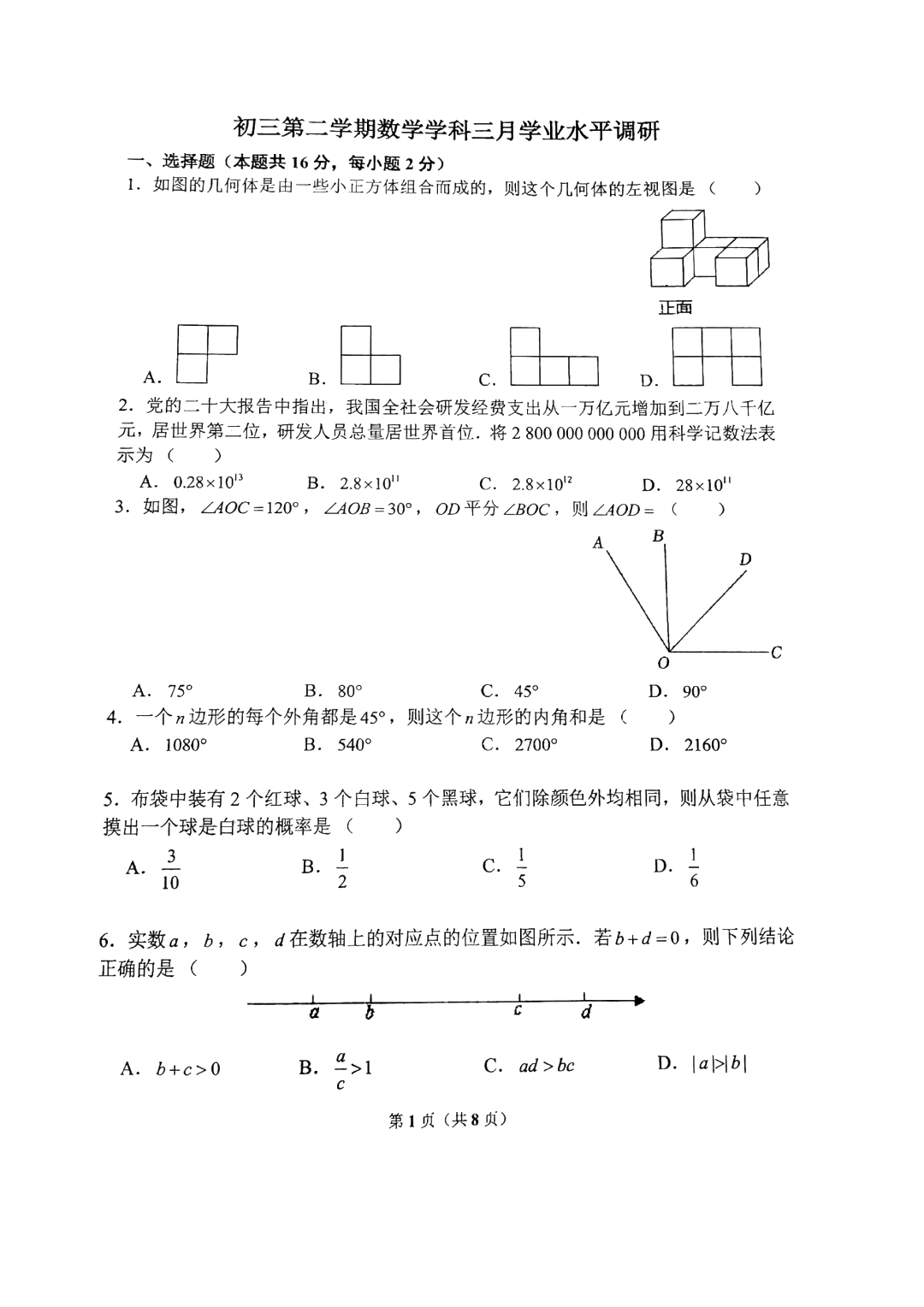 2023北京首师附中初三3月学业水平调研数学试题及答案