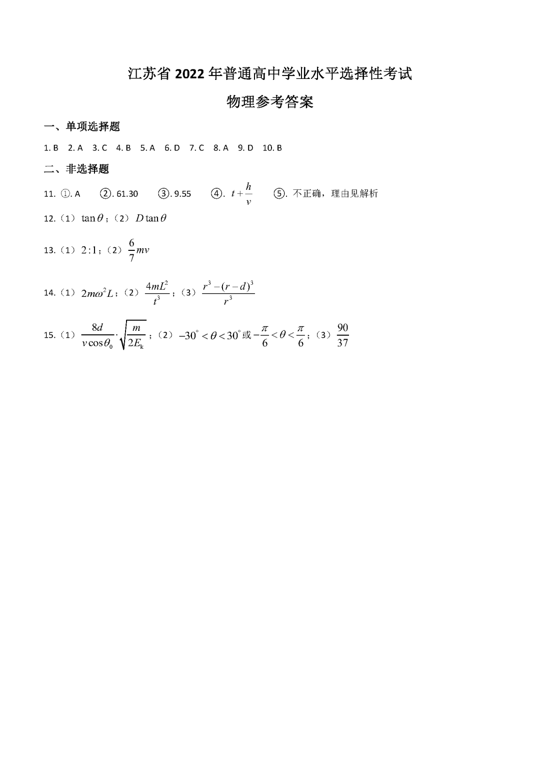 2022年江苏高考物理试题及答案