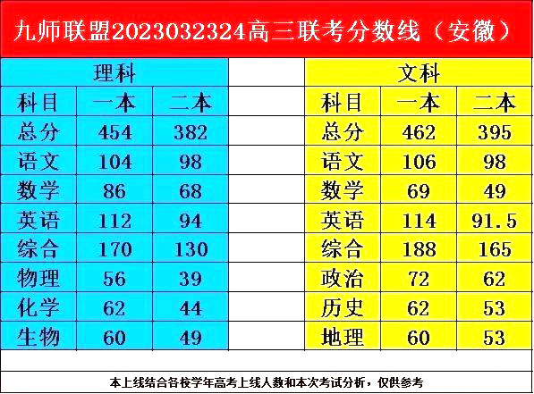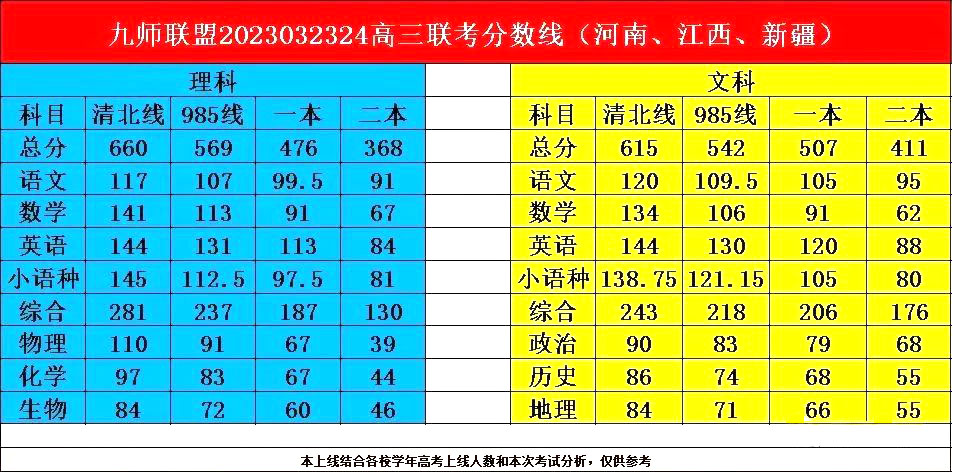 2023九师联盟高三3月联考分数线已公布,北京高考在线团队特意整理了河南、、江西、新疆、安徽等地区的分数线,包括清北线、985线、一本线、二本线数据,详情如下: