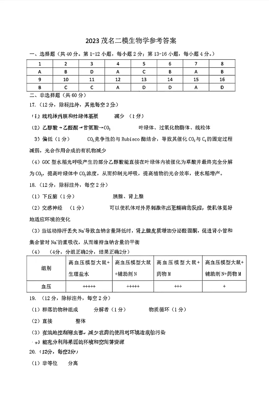 2023茂名二模茂名二模生物试题答案