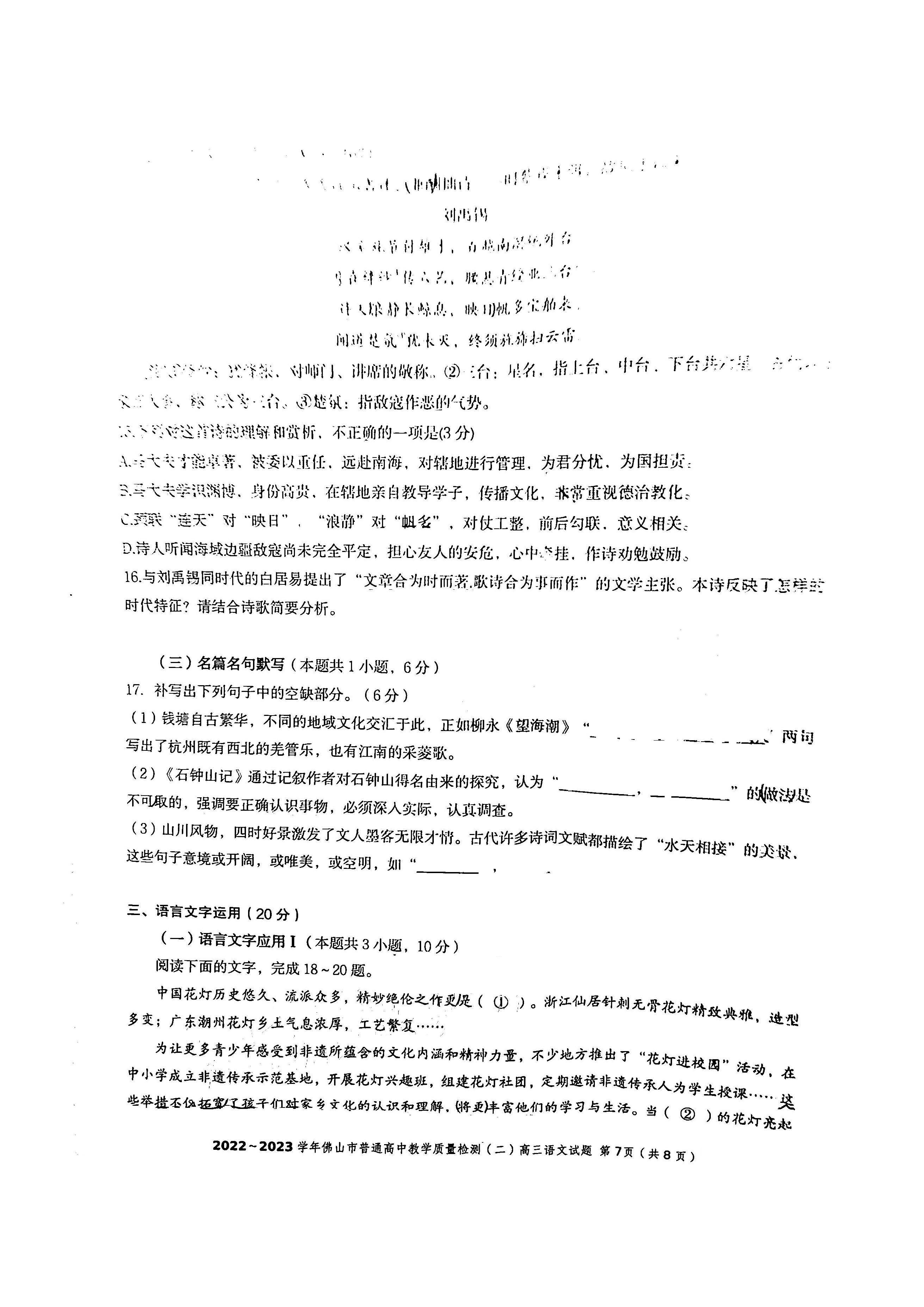 2023年广东佛山高三二模语文试题及答案