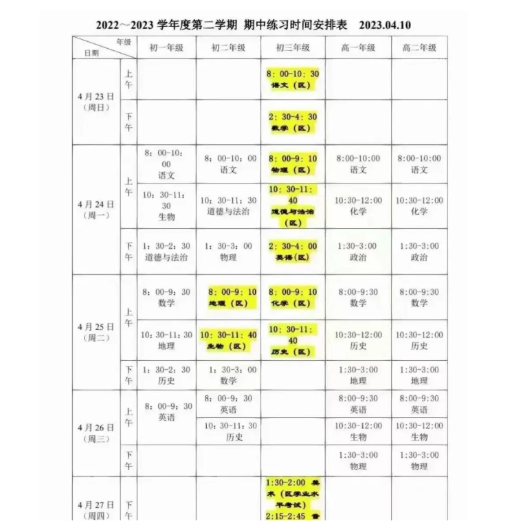 2022-2023下半学期已经过半,这也意味着光靠考生将迎来下学期期中考试。为了帮助广大考生了解考试安排,做好备考准备,北京高考在线团队为大家整理了2023北京市海淀区初高中期中考试时间安排详情如下: