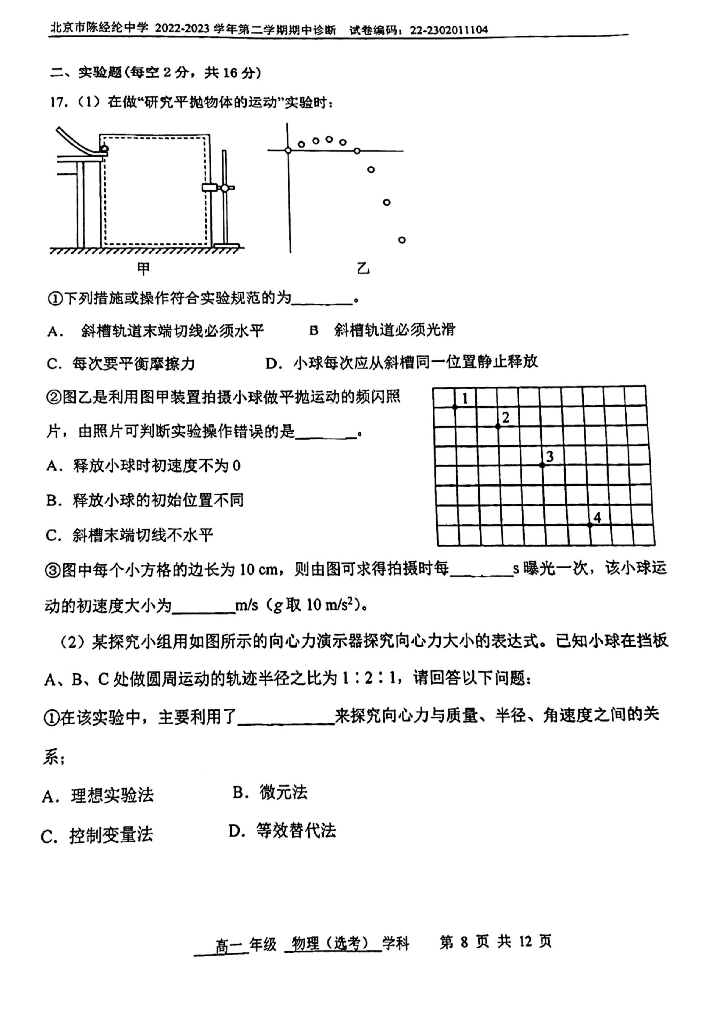 2022-2023学年北京陈经纶中学高一(下)期中物理试题及答案