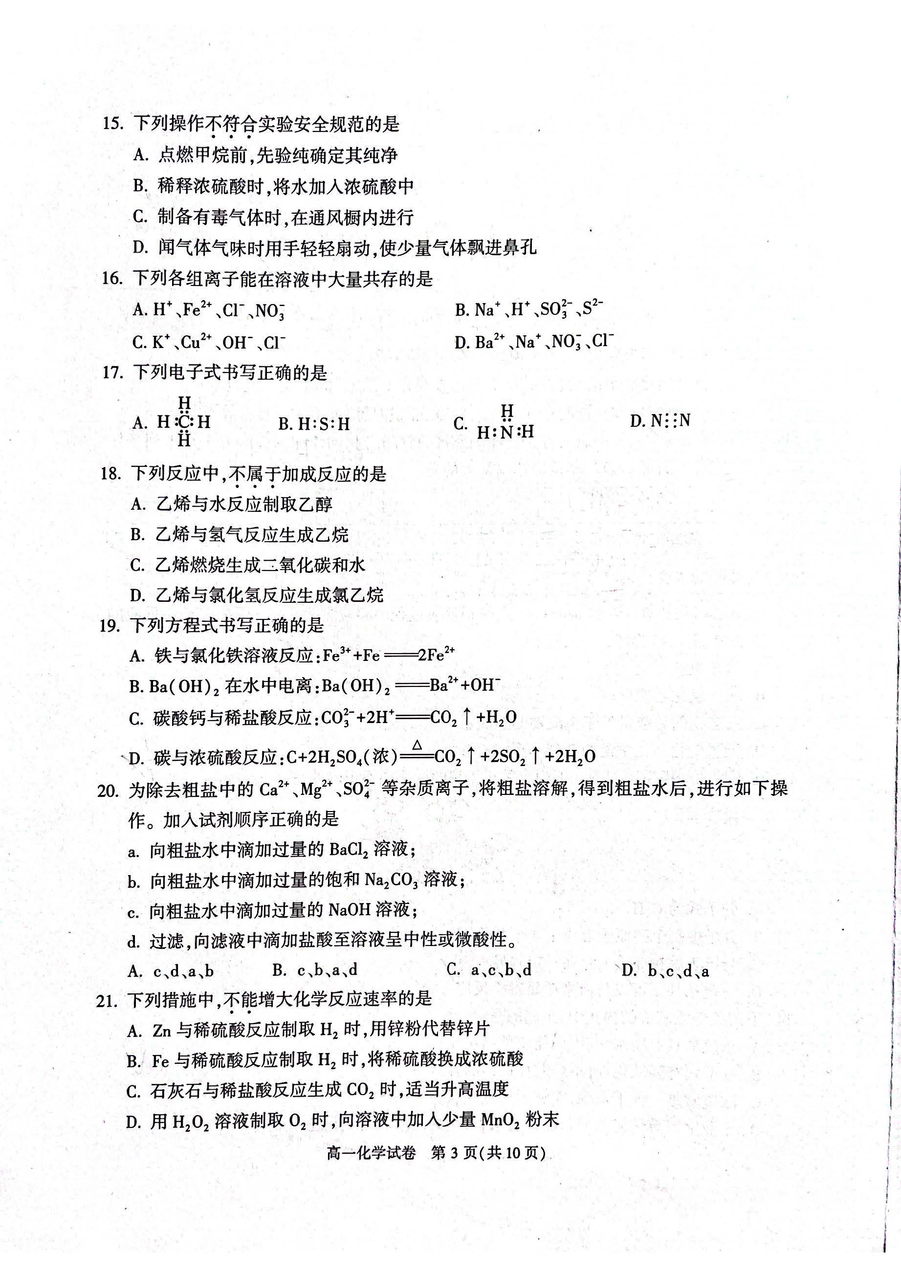 2023北京期中考试高一下学期期中考试顺义期中化学试题