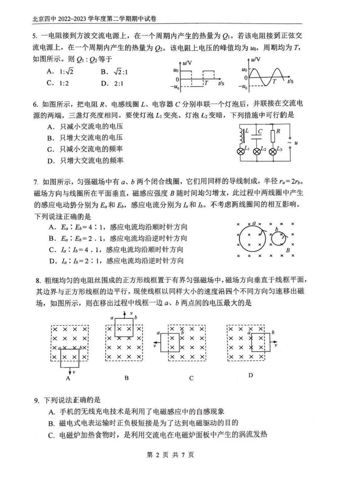 2023北京四中高二(下)期中物理试题及答案