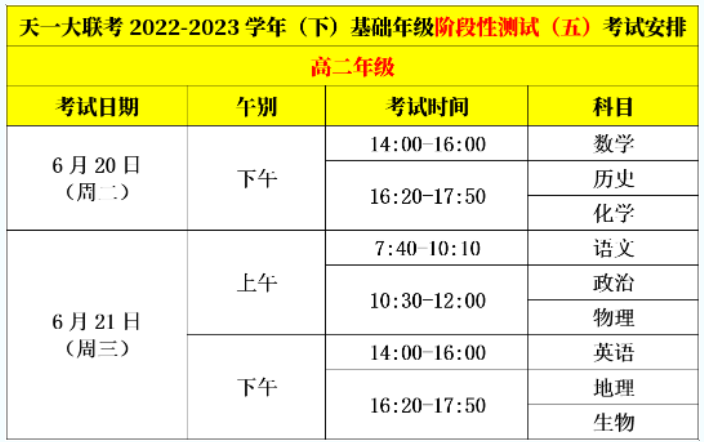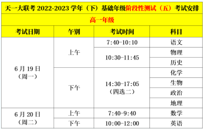 2023年6月,高一高二年级组织2022-2023学年天一大联考基础年级阶段性测试五考试时间安排,一起来看具体考试时间表。
