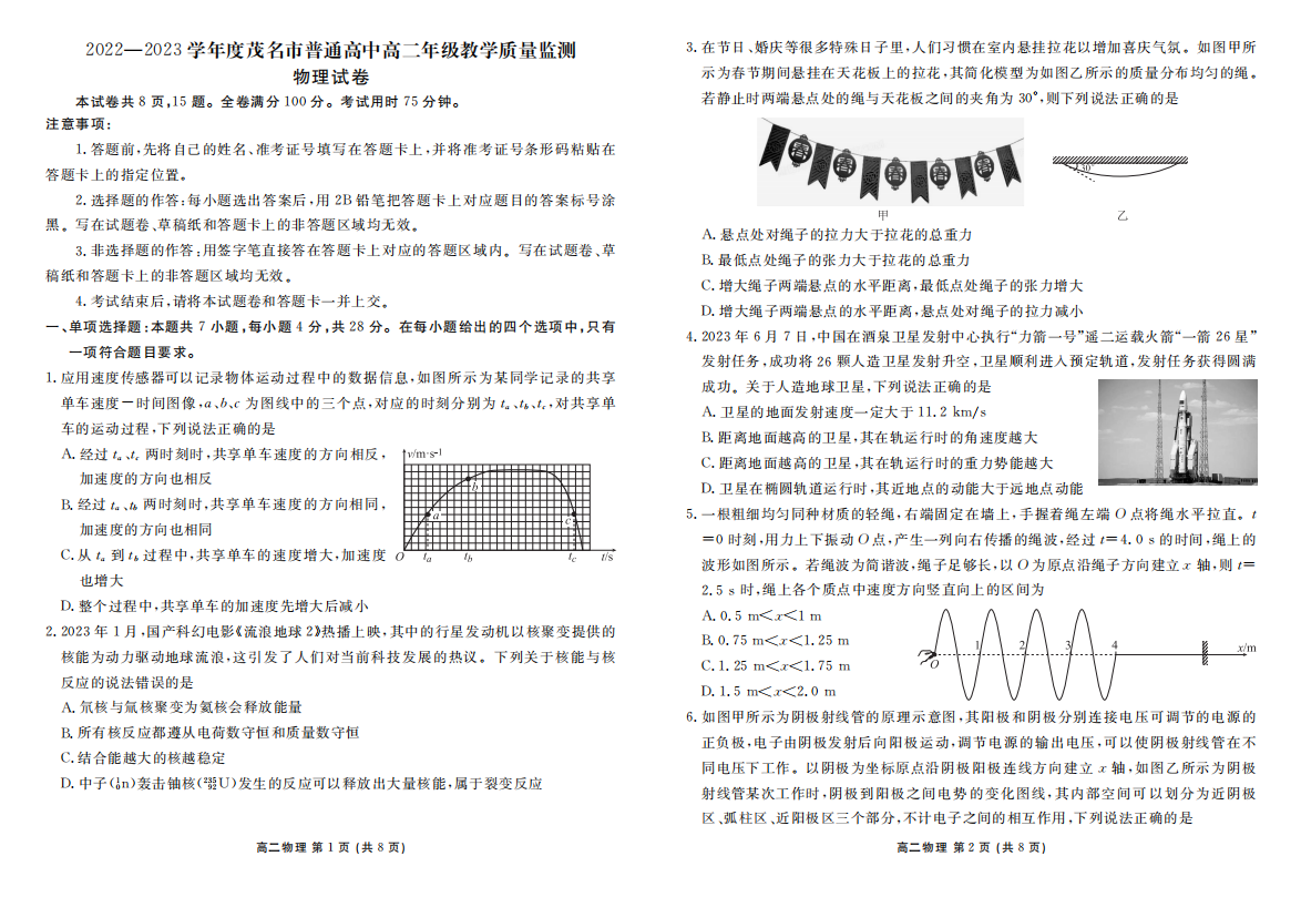 2022-2023学年广东茂名高二下学期教学质量监测物理试题及答案