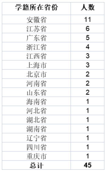 从上表录取名单可以看到,来自安徽的考生人数最多,为11人,占总录取人数的24.44%。其次为江苏省,录取6人,广东5人。具体省份分布如下: