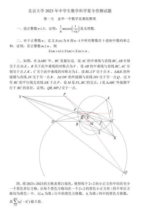 北京大学2023年中学生数学科学夏令营第一天测试题